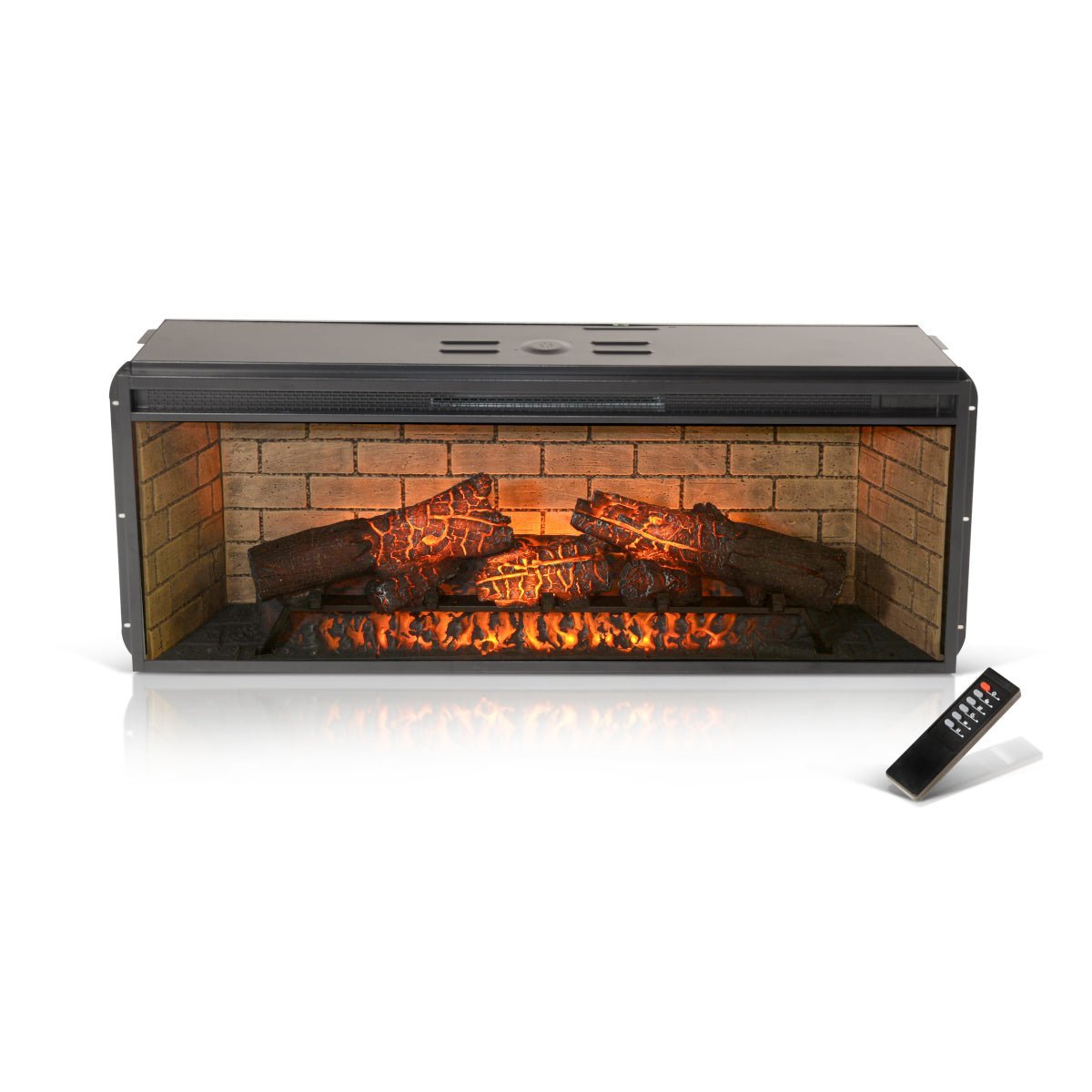 42″ Electric Fireplace Insert comes with a remote control, and features a brick styled background in the firebox. The infrared quartz heater provides supplemental zone heating for up to 1,000 sq ft. Use this fireplace all year long with or without heat. This electric fireplace insert is made for the Sunny Designs TV media consoles.